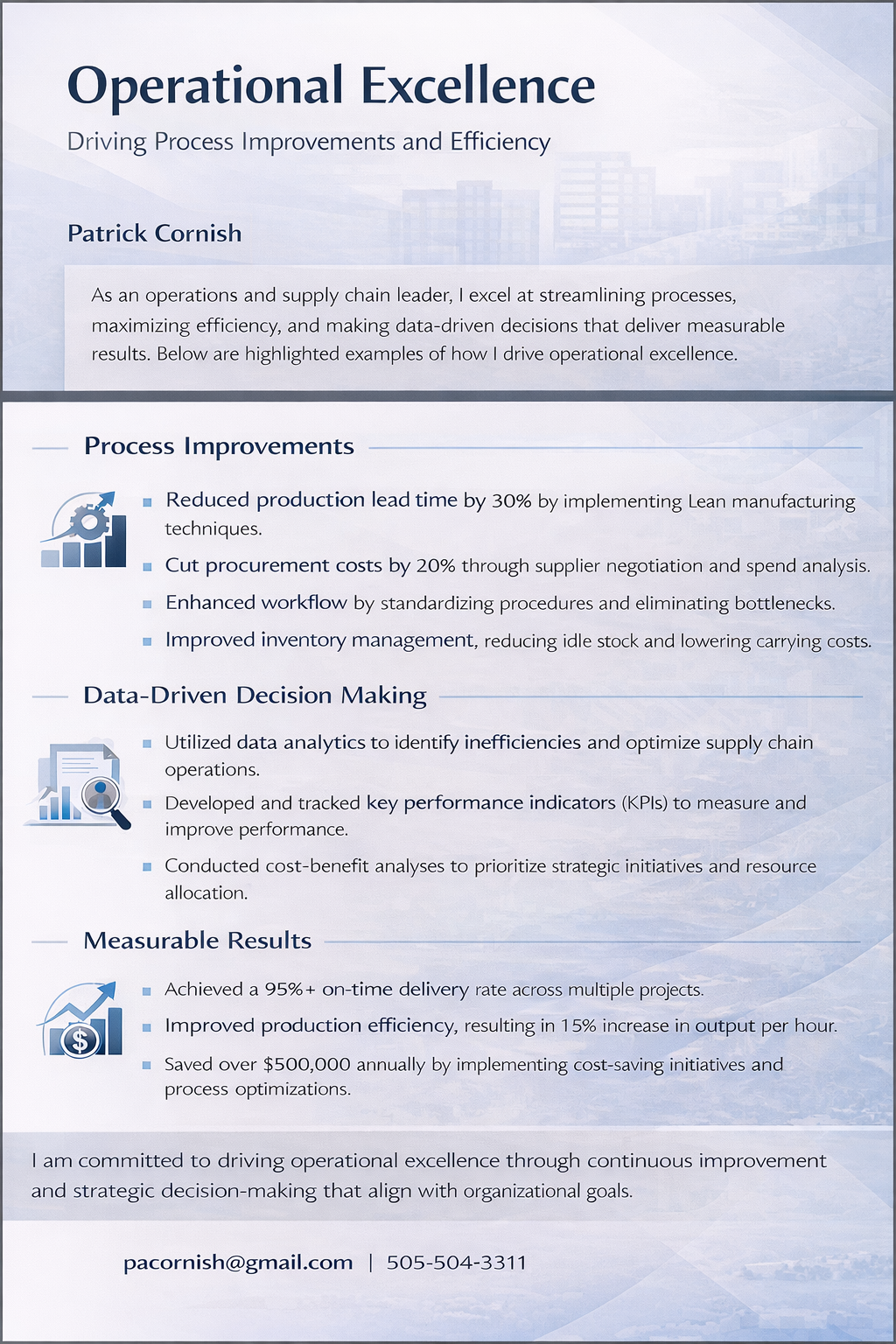 I possess a proven ability to optimize supply chains, conduct strategic sourcing, and negotiate effectively with vendors, consistently identifying cost-saving opportunities and ensuring timely resource delivery. My approach goes beyond mere task management; I bring an end-to-end operational insight that understands how procurement, quality, and process improvements collectively impact the entire organization. This holistic view ensures that every strategic decision contributes directly to overall efficiency and profitability.
